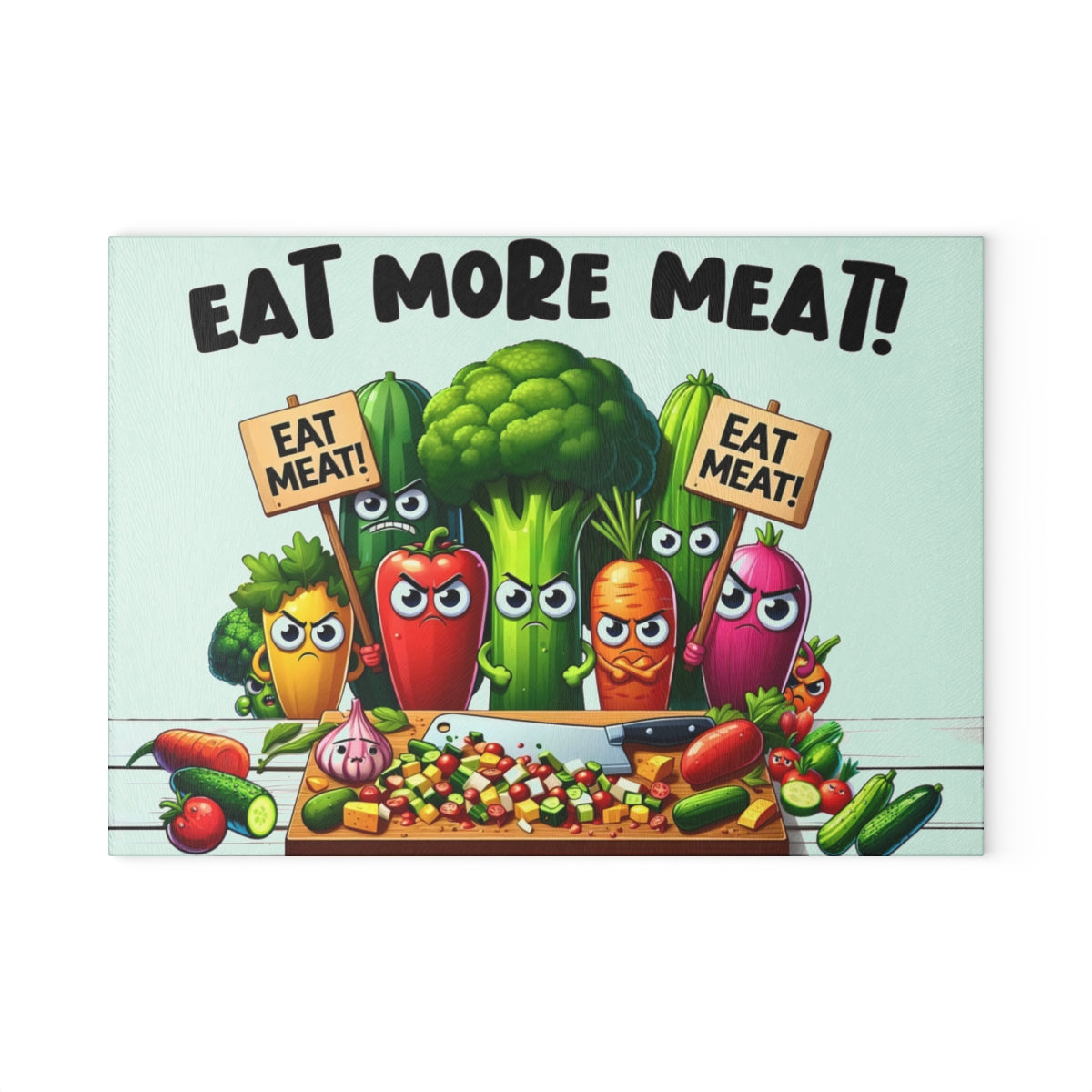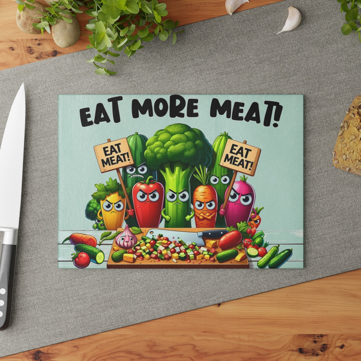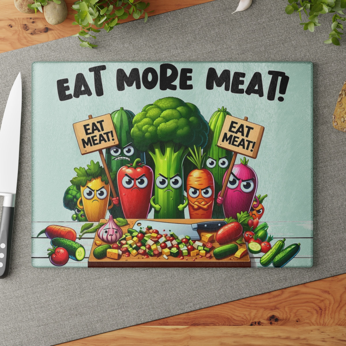 This cutting board features angry vegetables urging you to eat more meat, adding a touch of humor to your kitchen. Perfect for meat lovers and those with a quirky sense of style. Ideal for housewarmings, birthdays, and holidays like Father's Day.