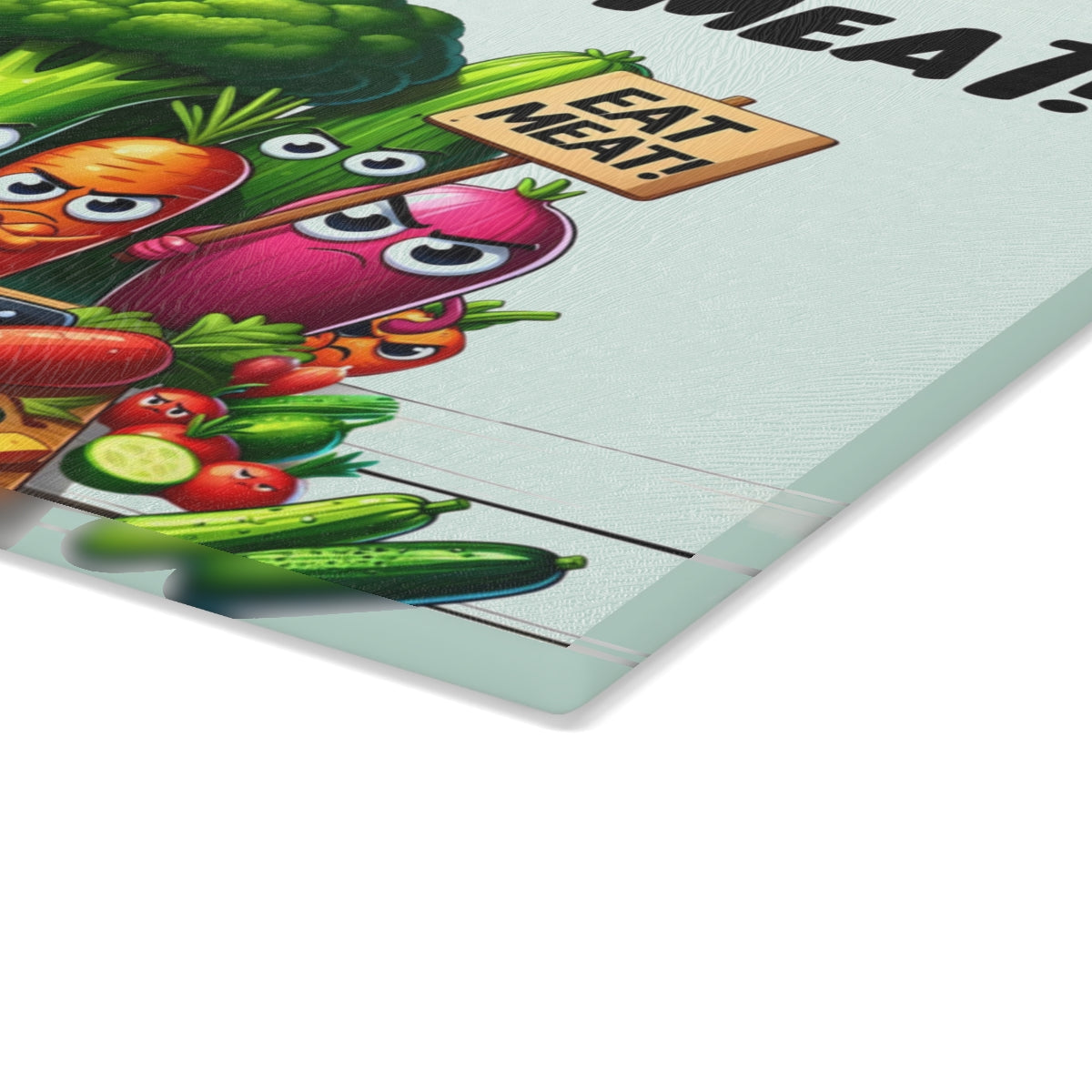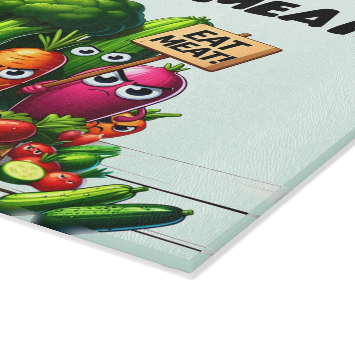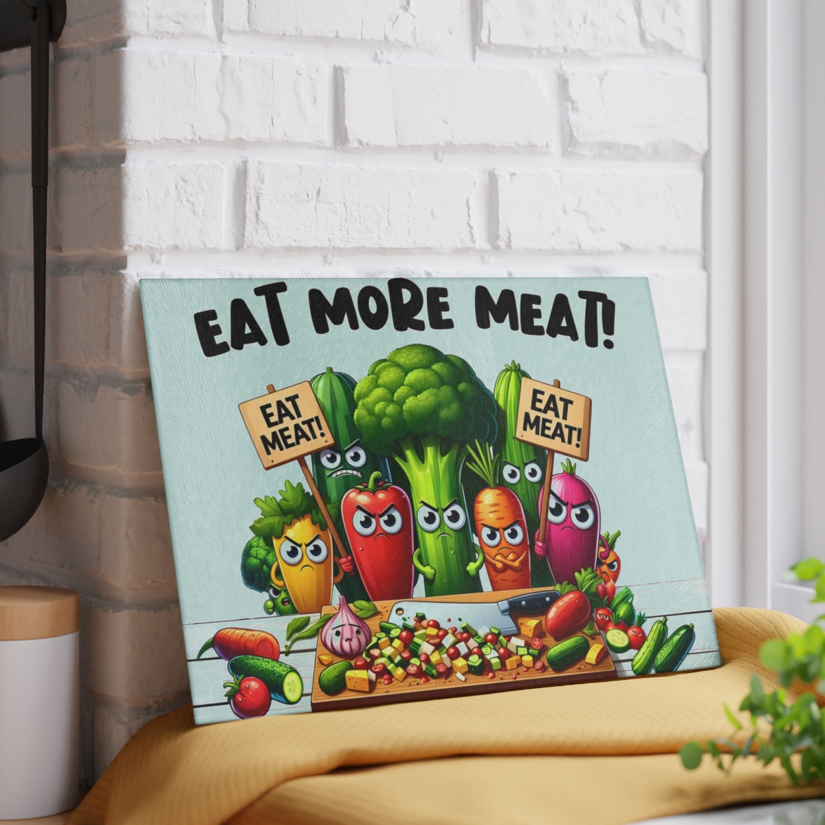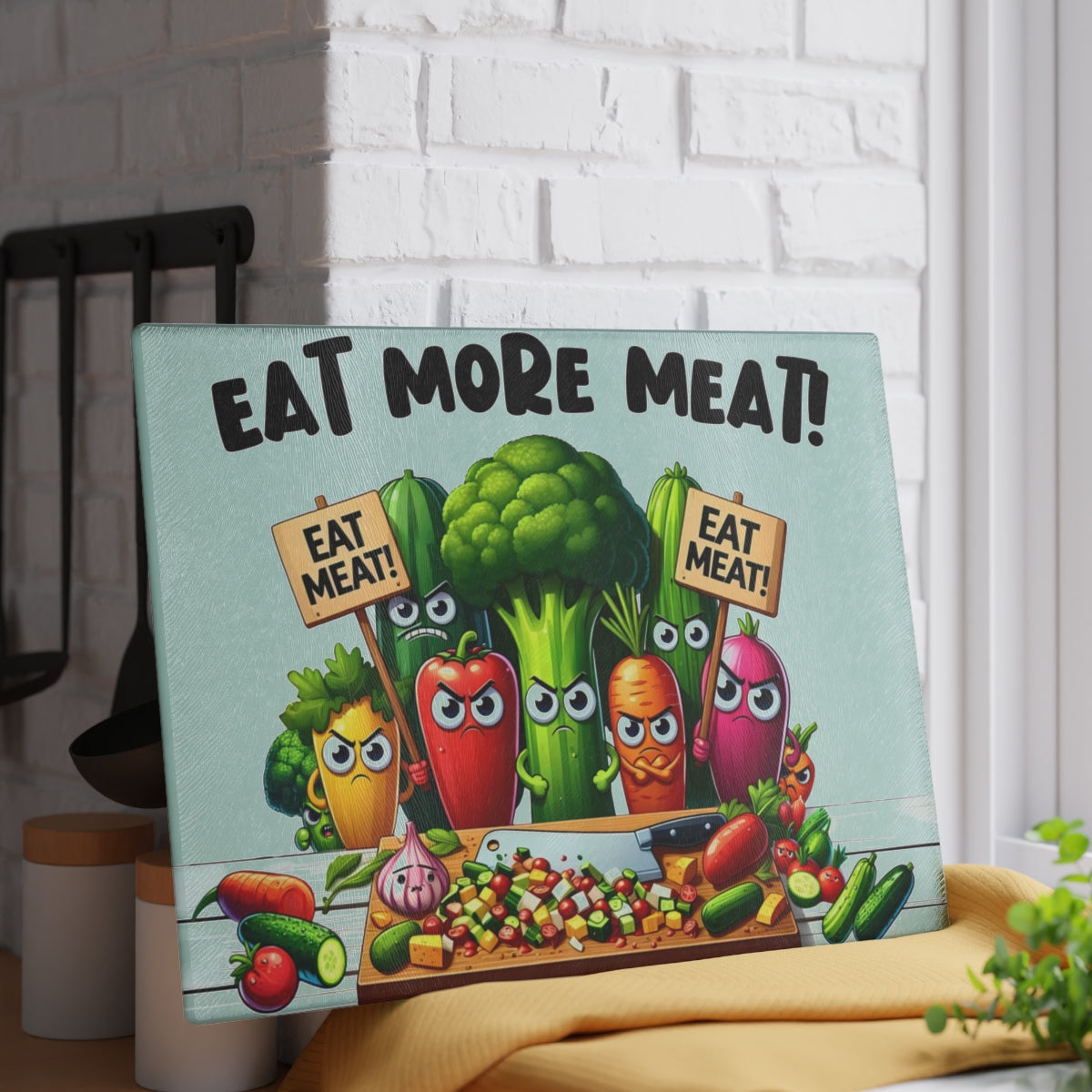 This cutting board features angry vegetables urging you to eat more meat, adding a touch of humor to your kitchen. Perfect for meat lovers and those with a quirky sense of style. Ideal for housewarmings, birthdays, and holidays like Father's Day.