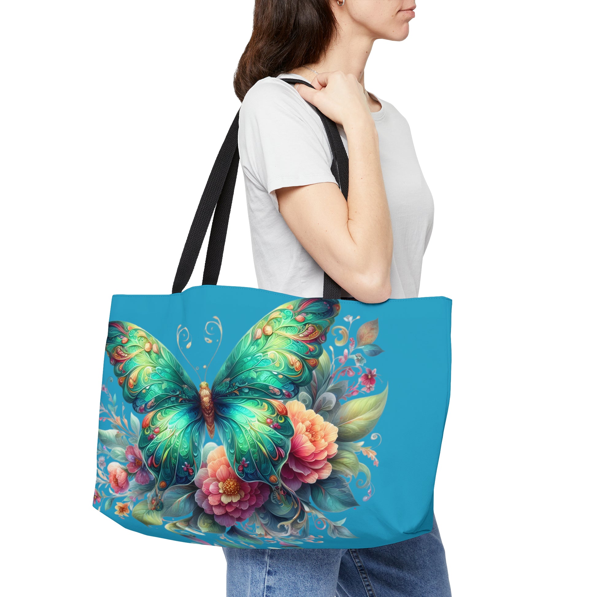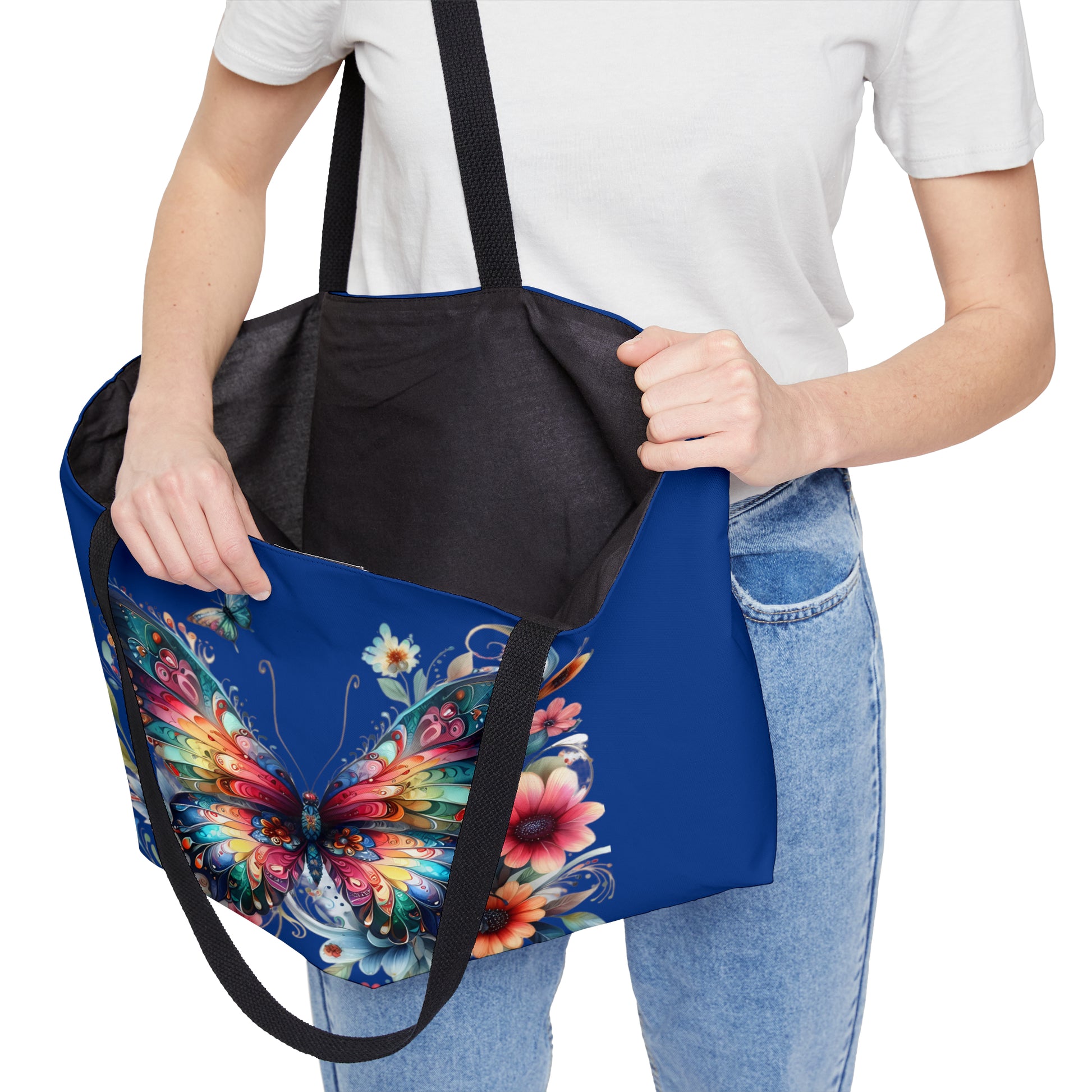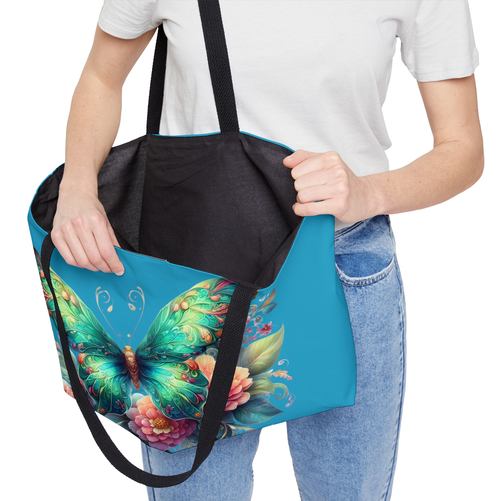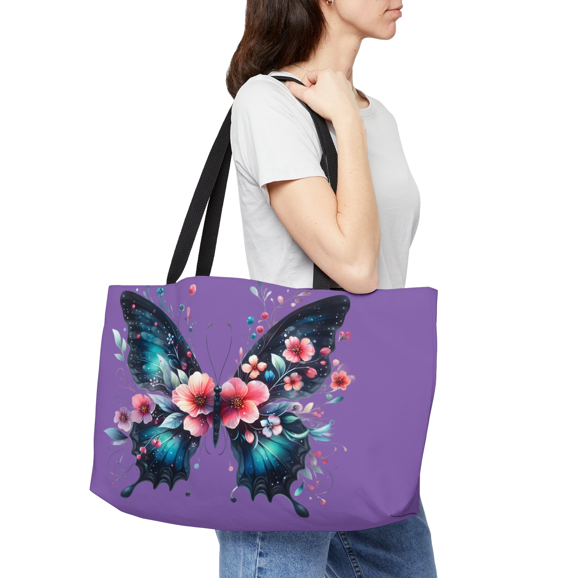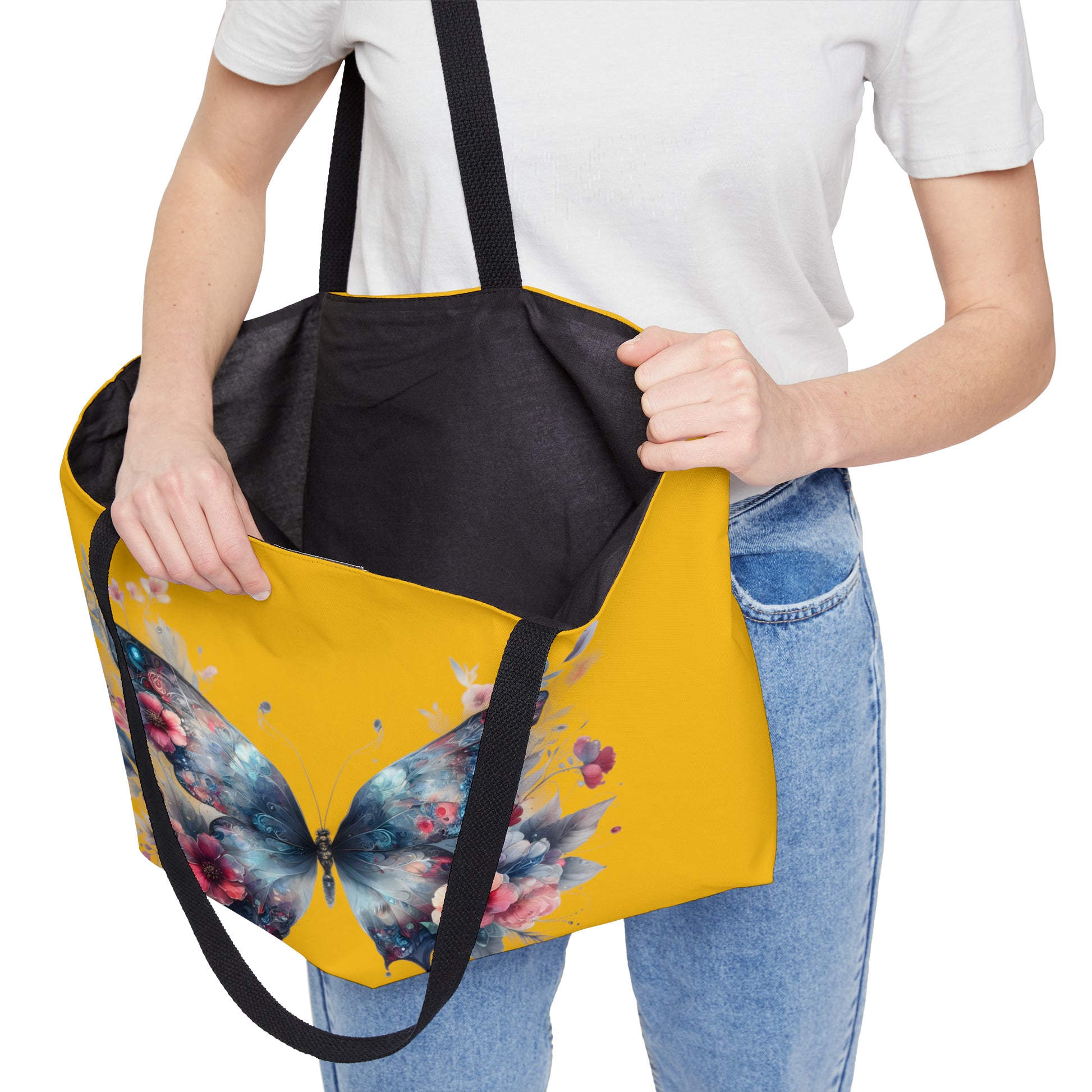 These weekender bags come in one size – 24" x 13" (60.9 cm x 33 cm) – perfect for those who love to travel light. Its t-bottom construction and black handles give it a sleek, classic look.