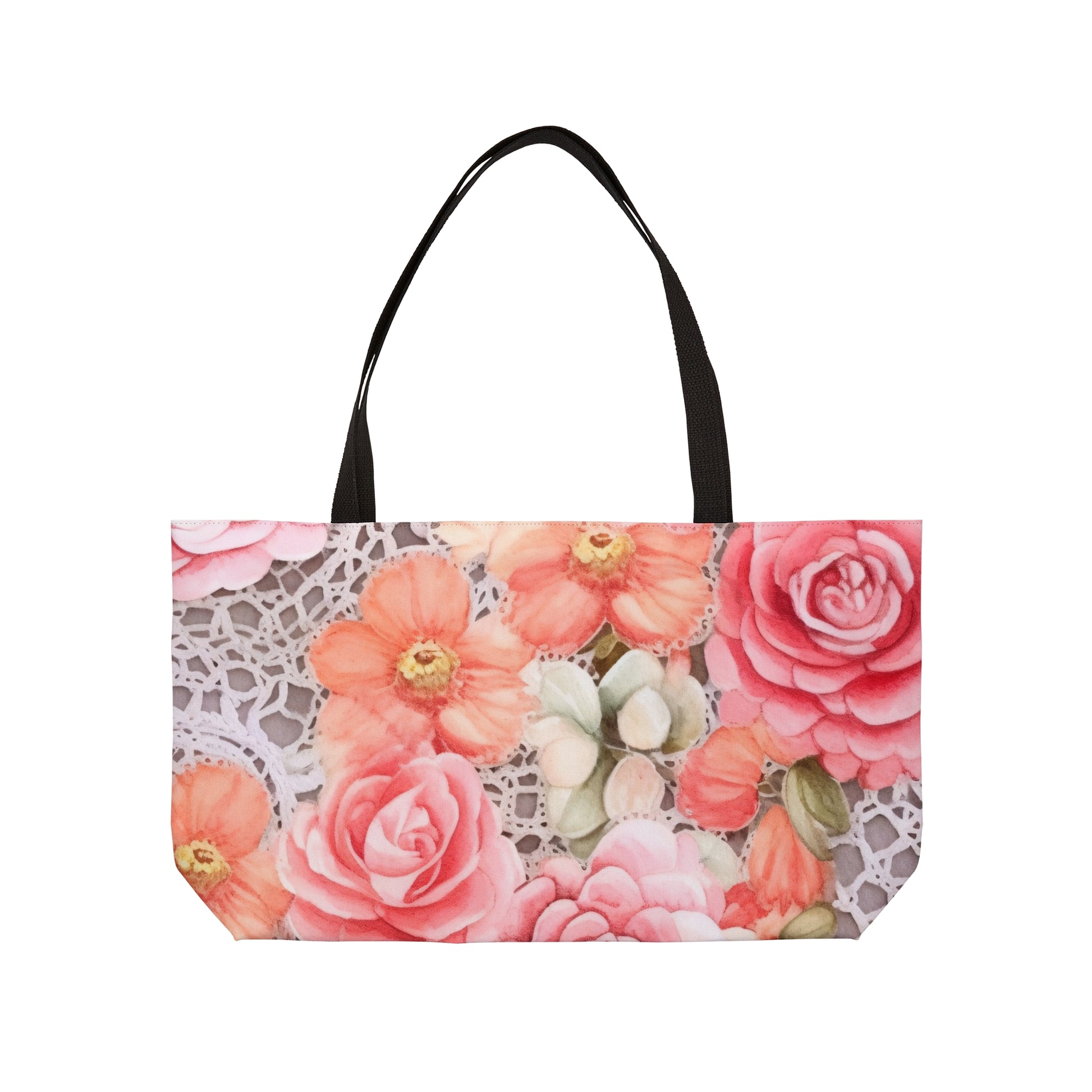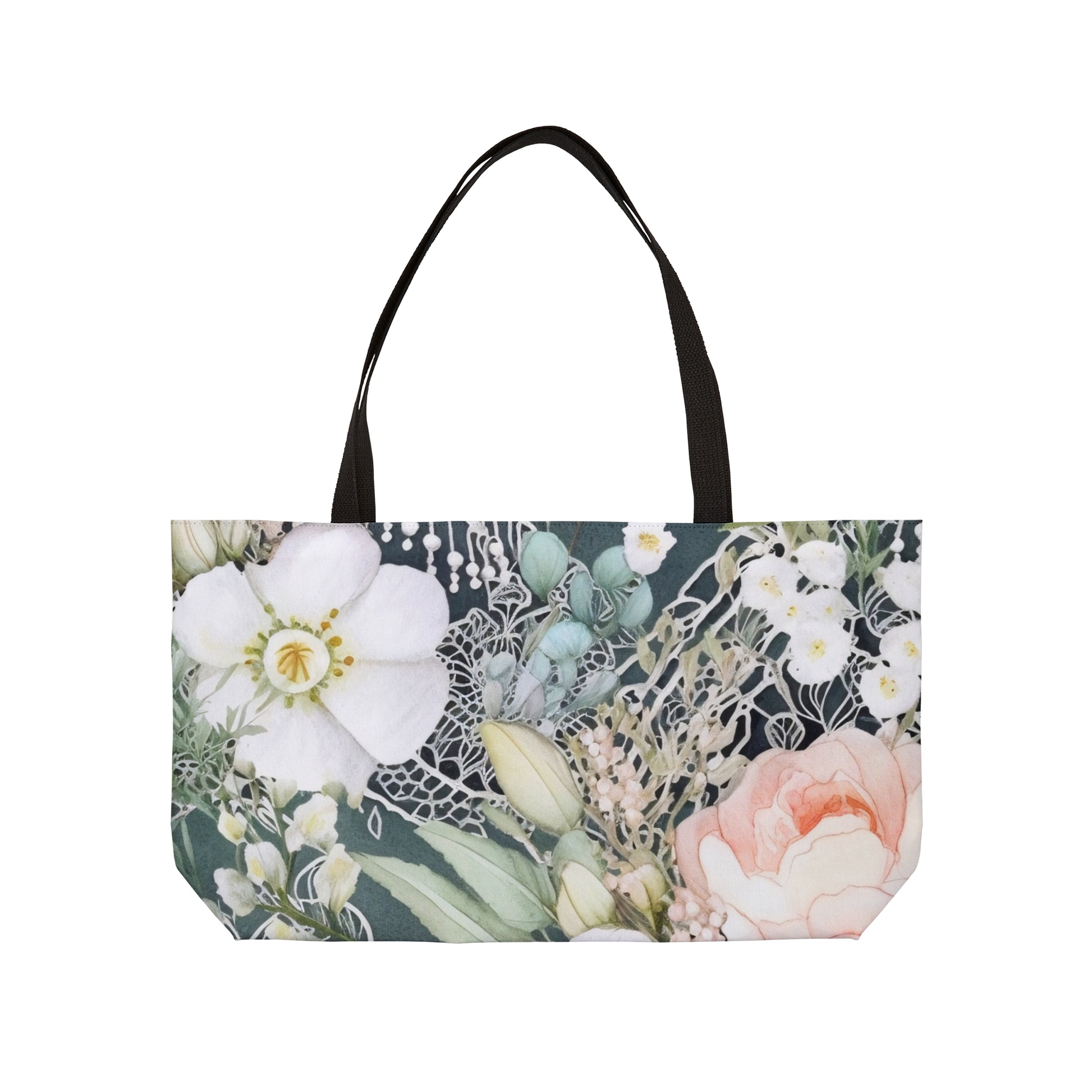 This personalized weekender bag comes in one size – 24" x 13" (60.9 cm x 33 cm) – perfect for those who love to travel light. Its t-bottom construction and black handles give it a sleek, classic look.