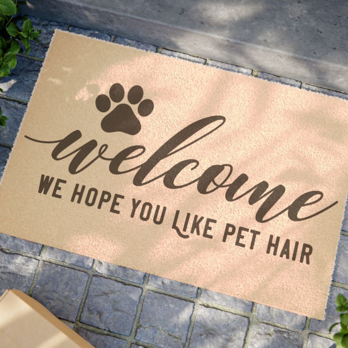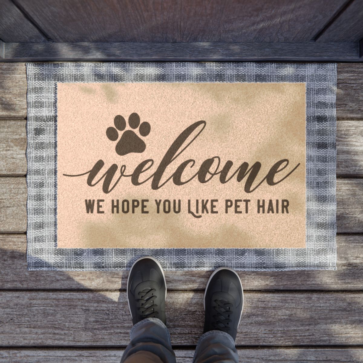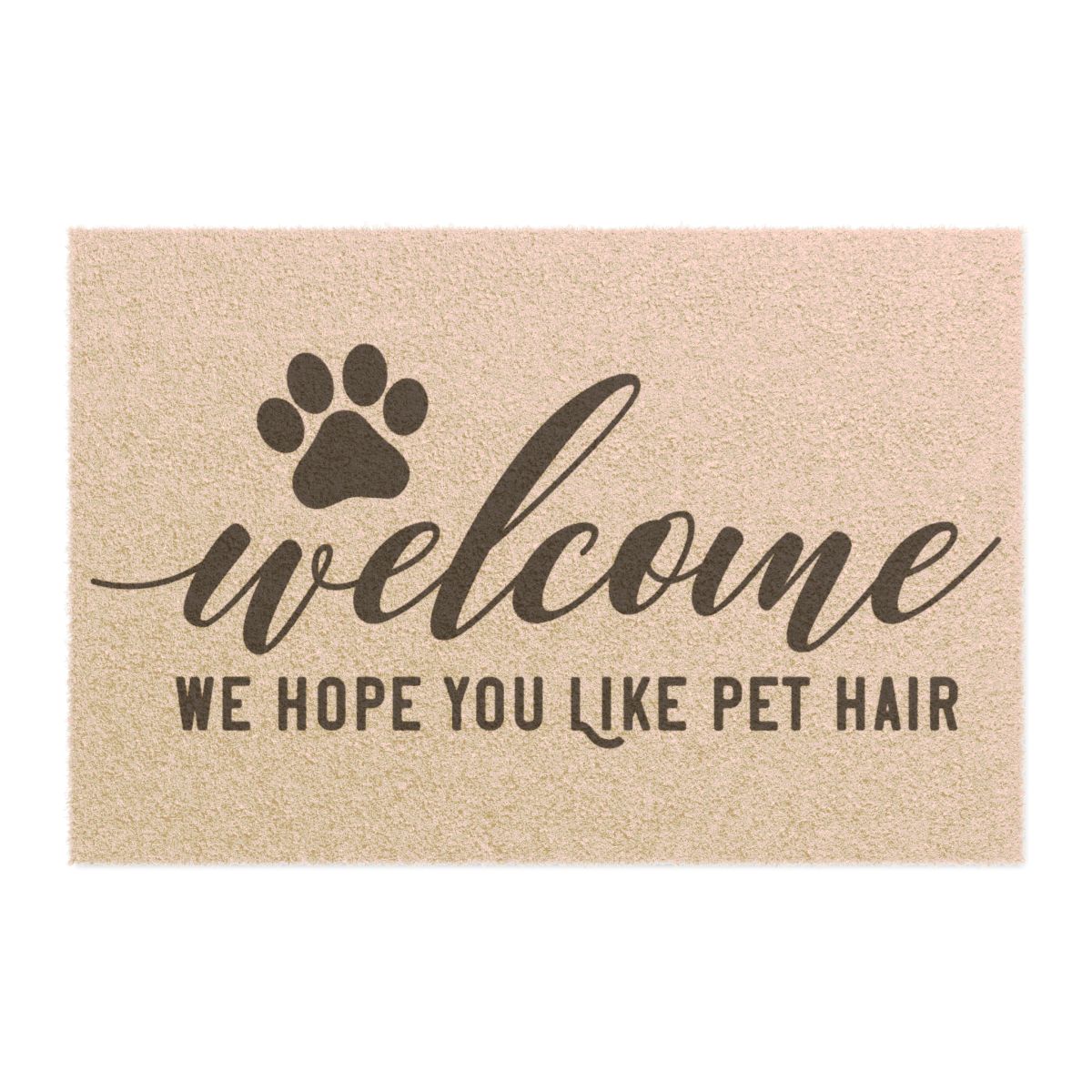 This charming doormat features the words 'Welcome Hope you like pet hair' and is perfect for pet owners who want to add a touch of humor to their entryway. The coir coconut fiber material makes it durable for outdoor use, and the anti-slip backing ensures it stays in place.