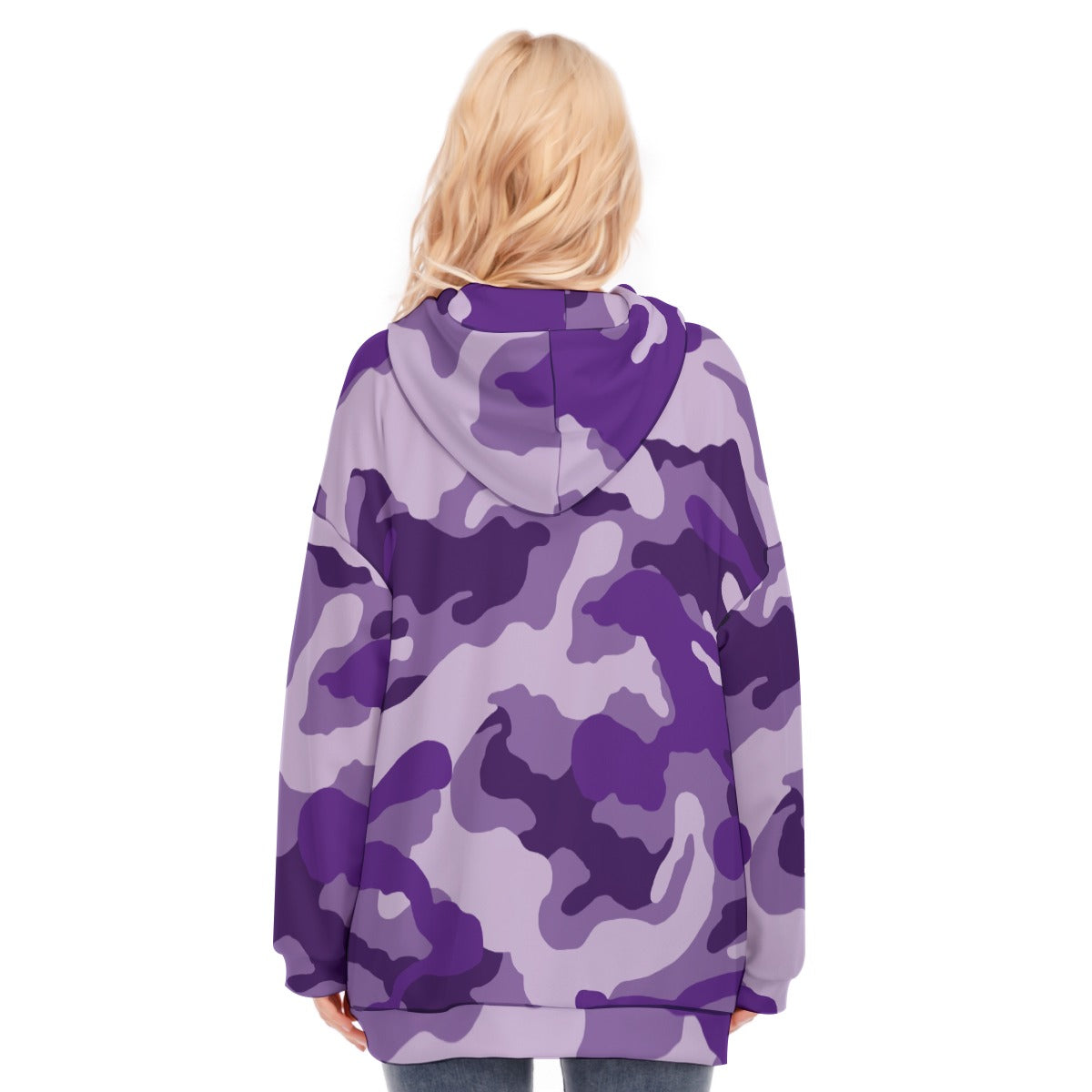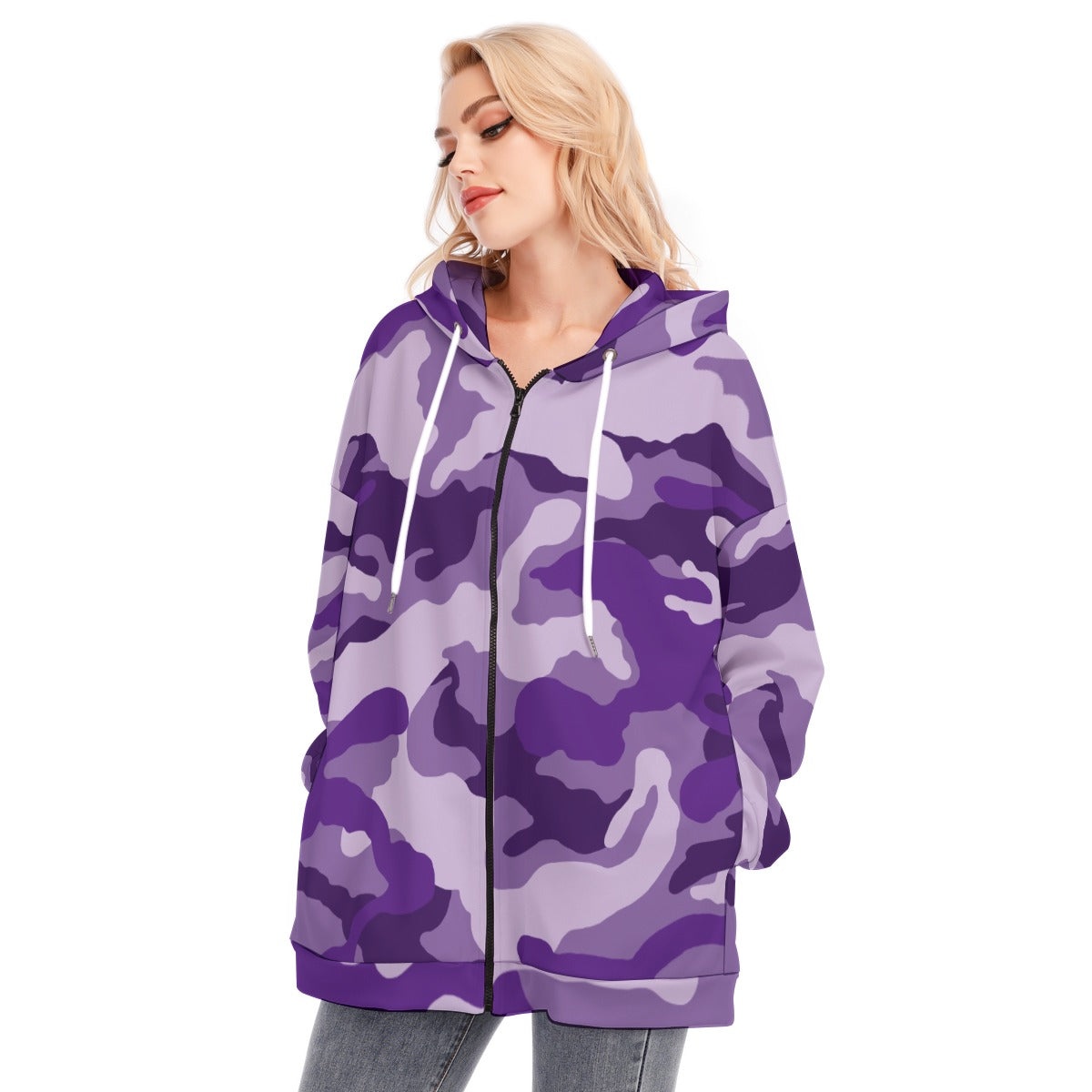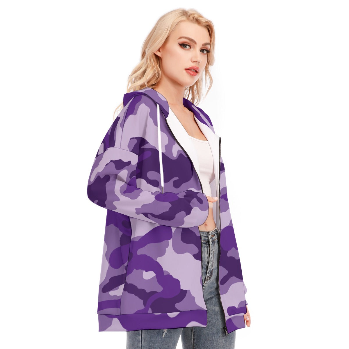 Long women's Purple Camo hoodie, zipper closure, classic style, long sleeves, with adjustable hood rope, can be worn daily