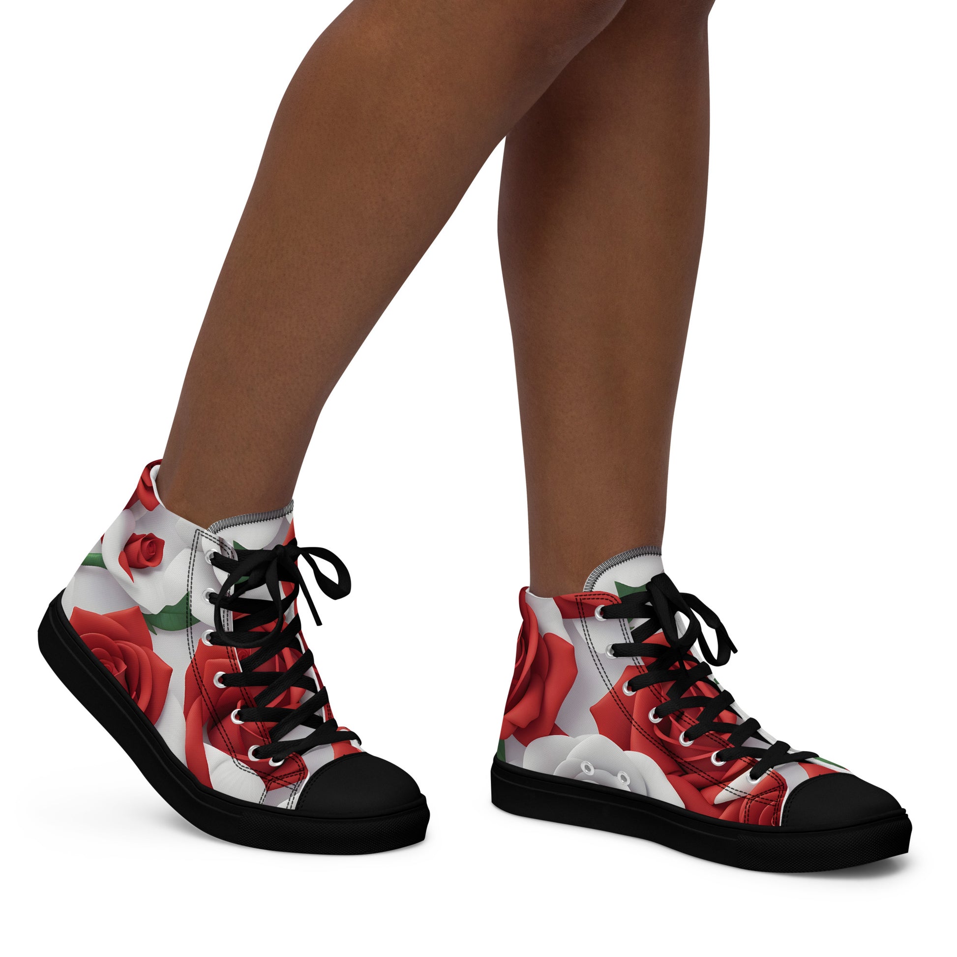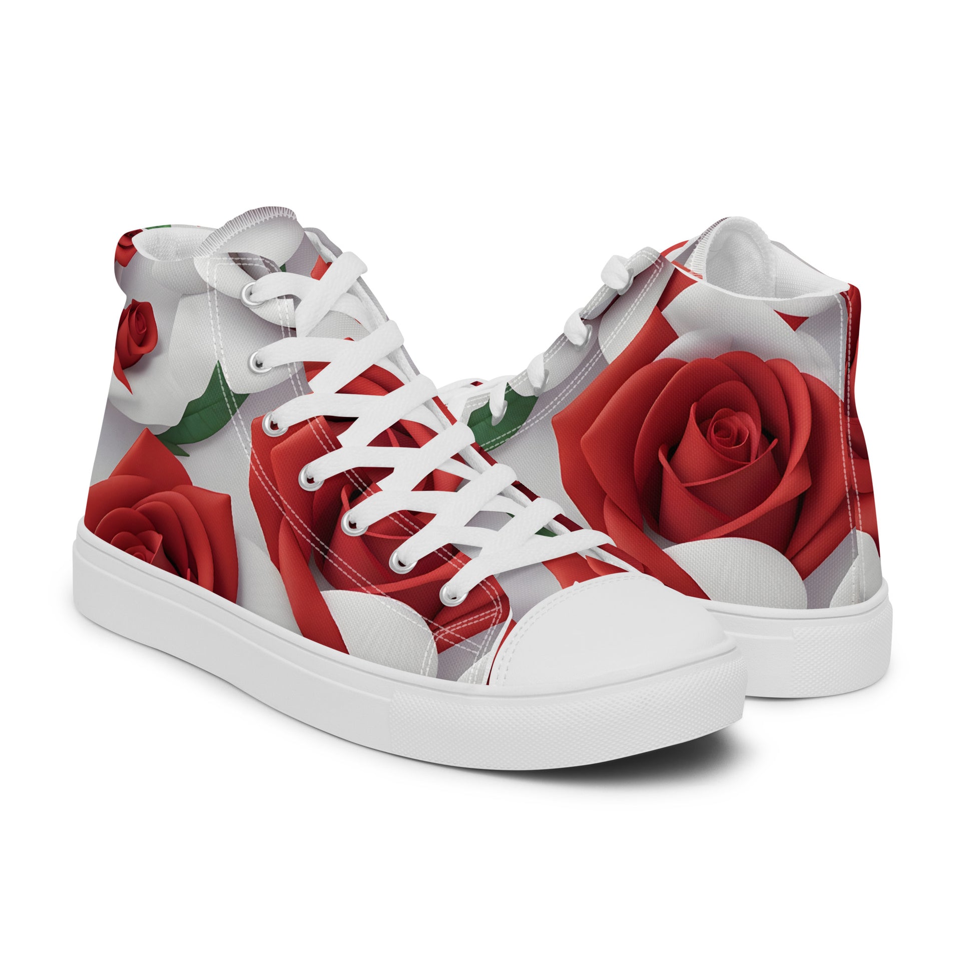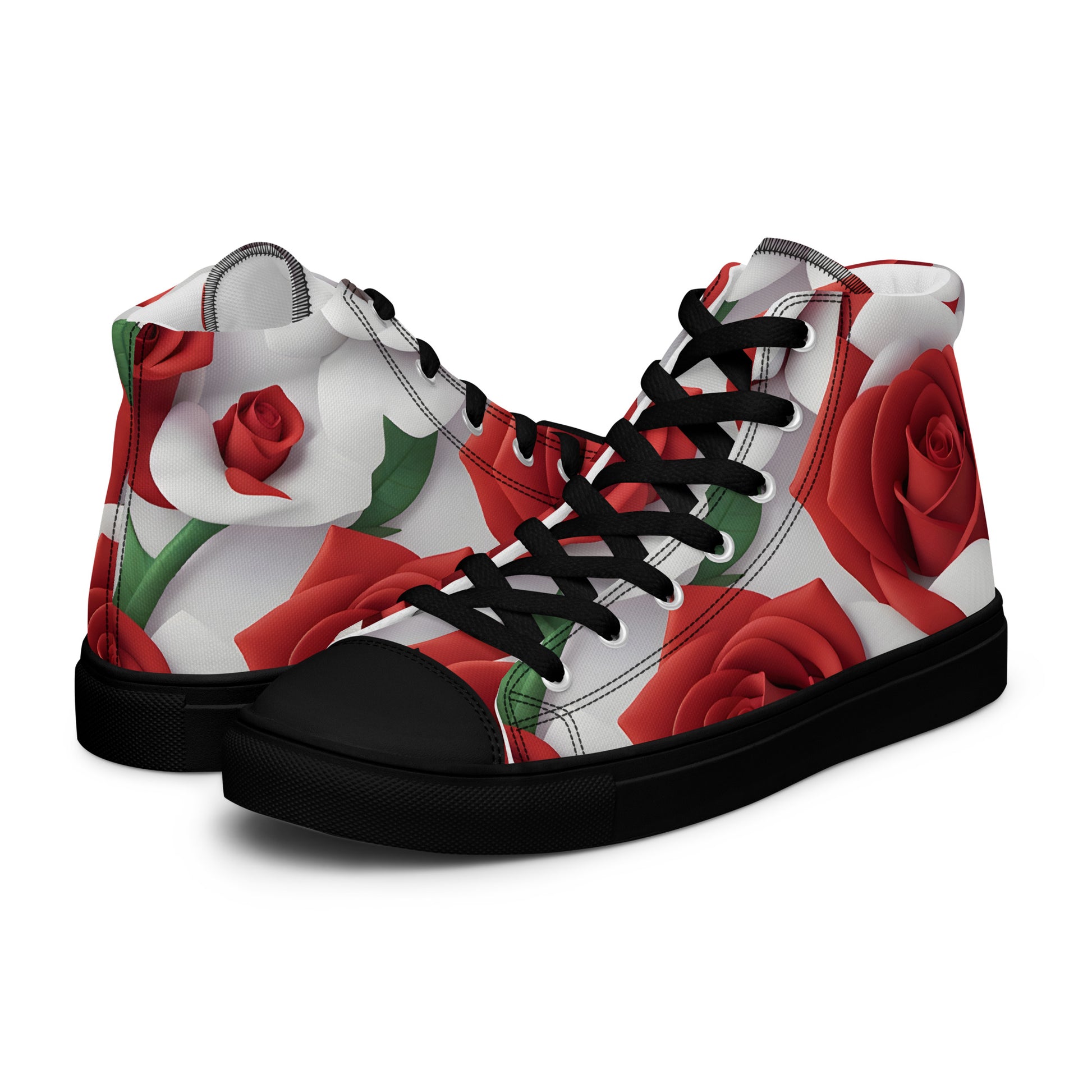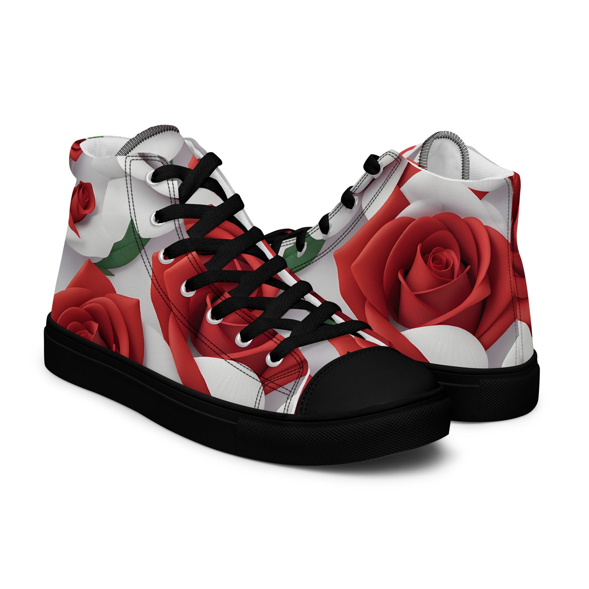 Shoes are what makes a look stand out—whether they match the outfit or not. The handmade Rose Print High Top Canvas Shoes have a retro feel to them, and can add the final touch to various clothing styles.