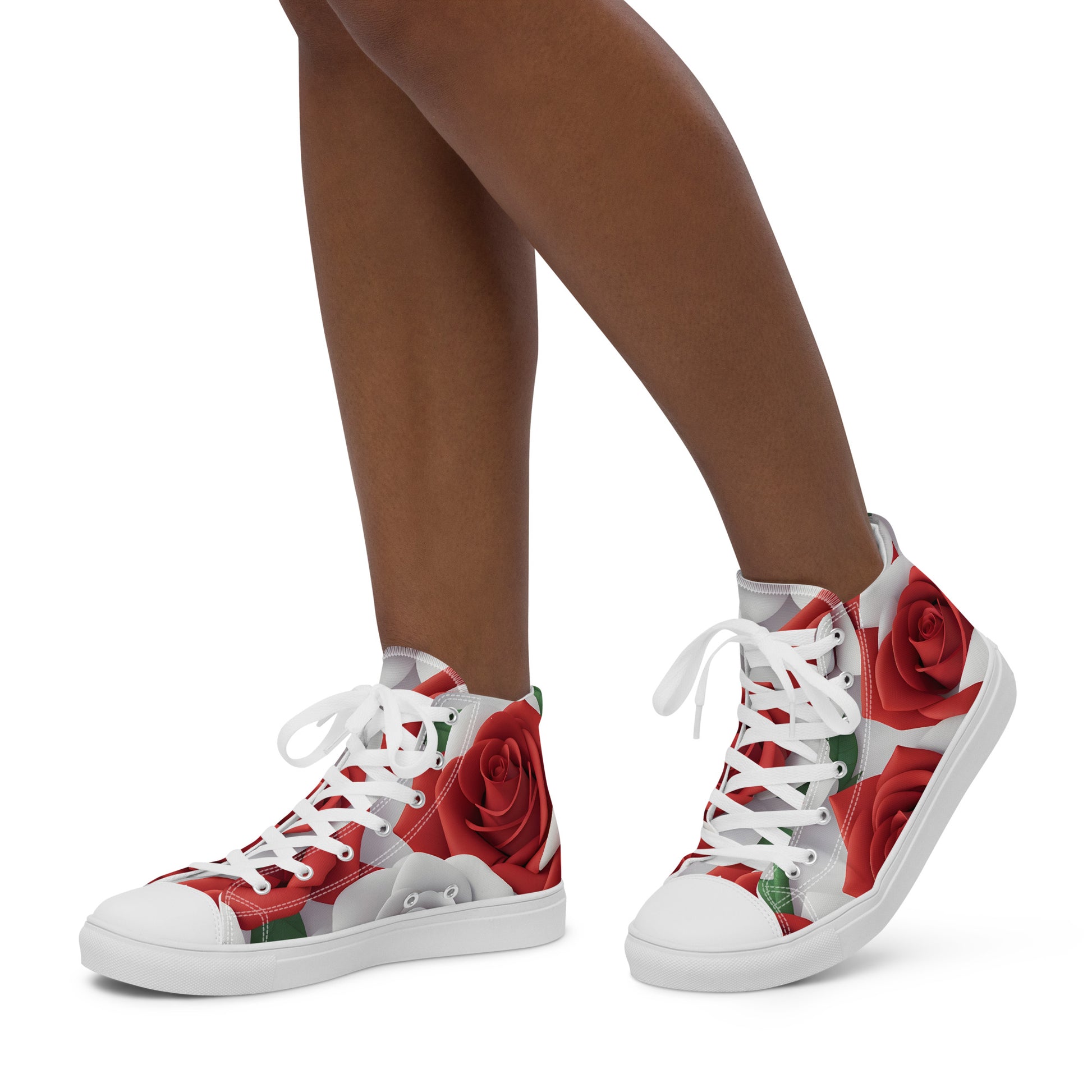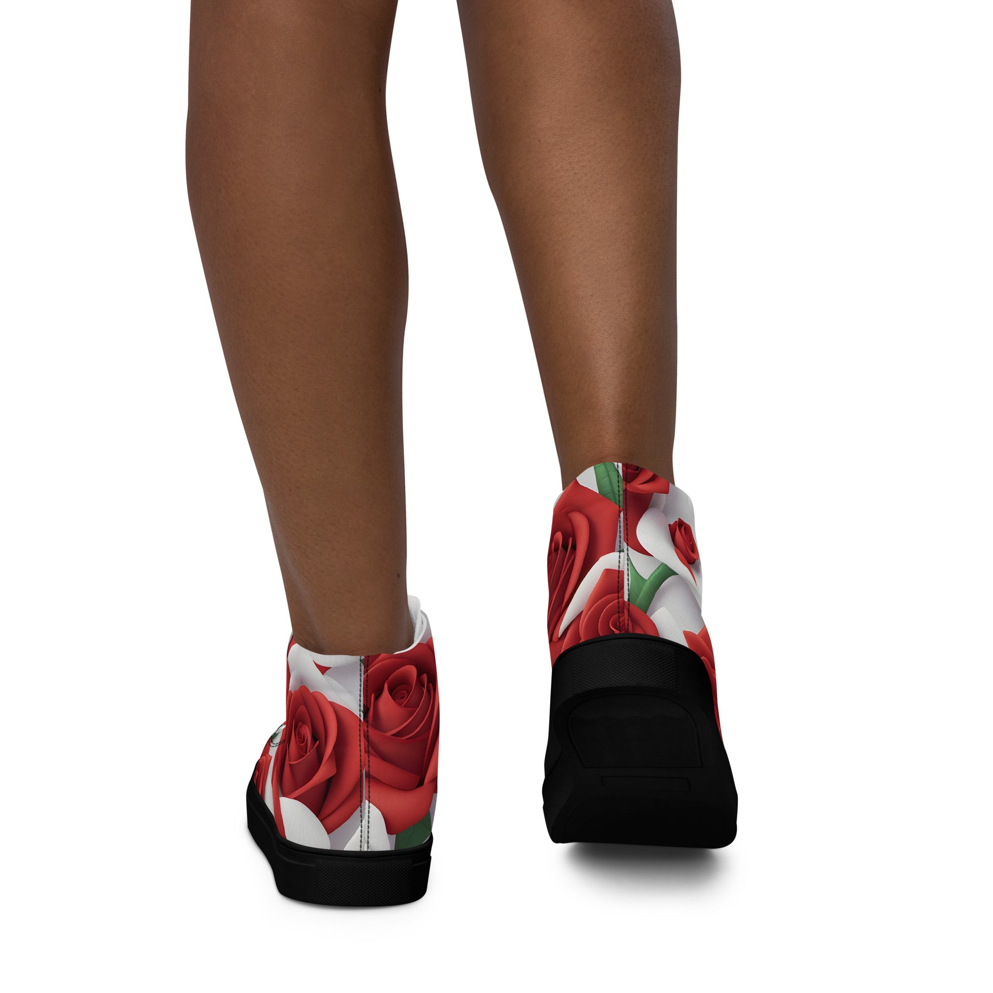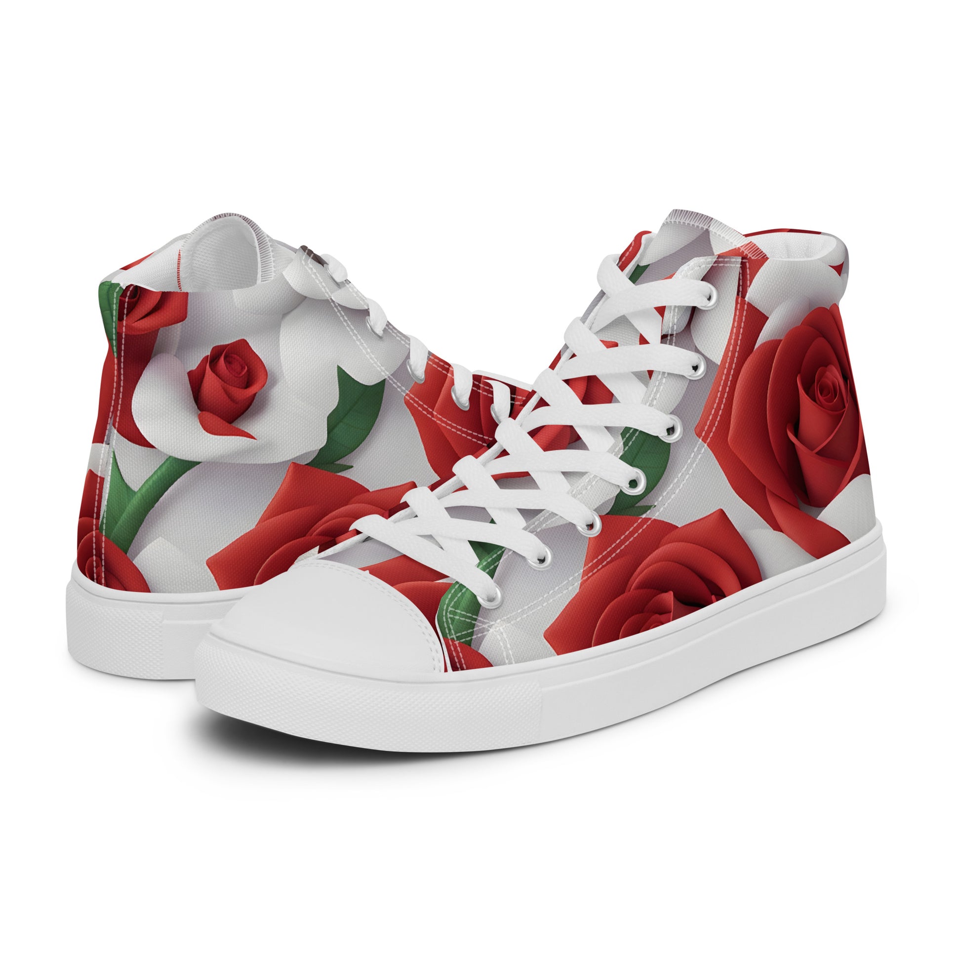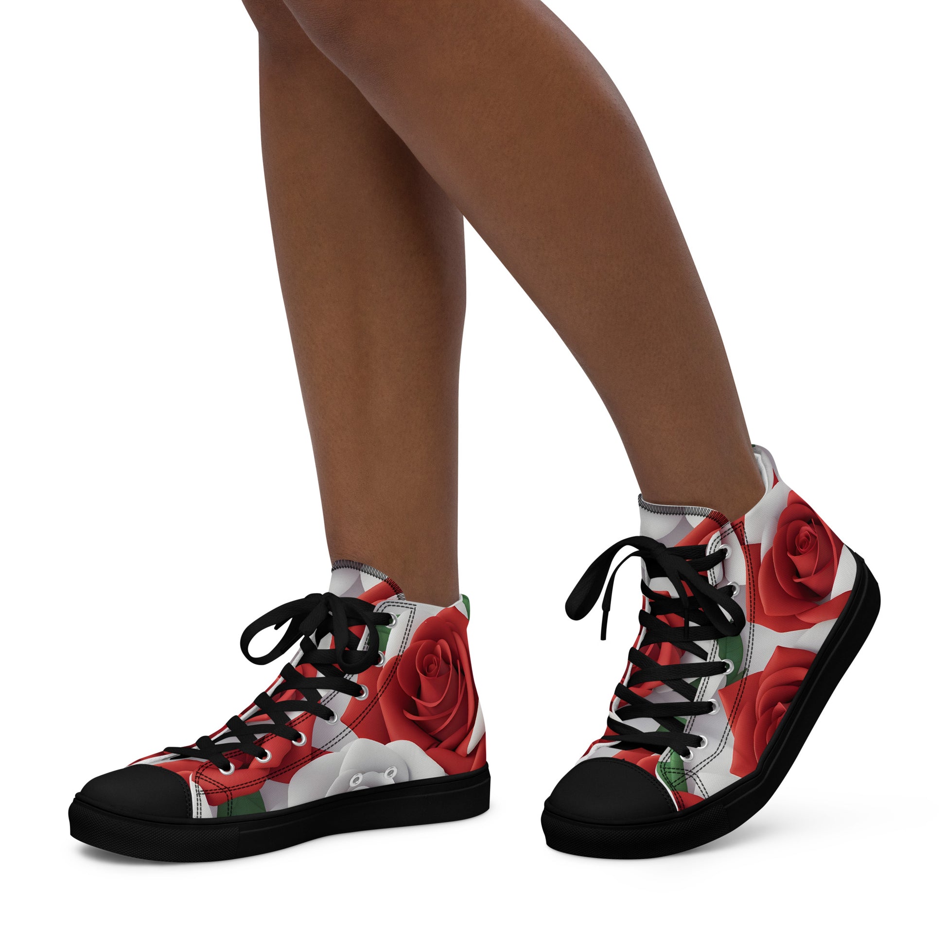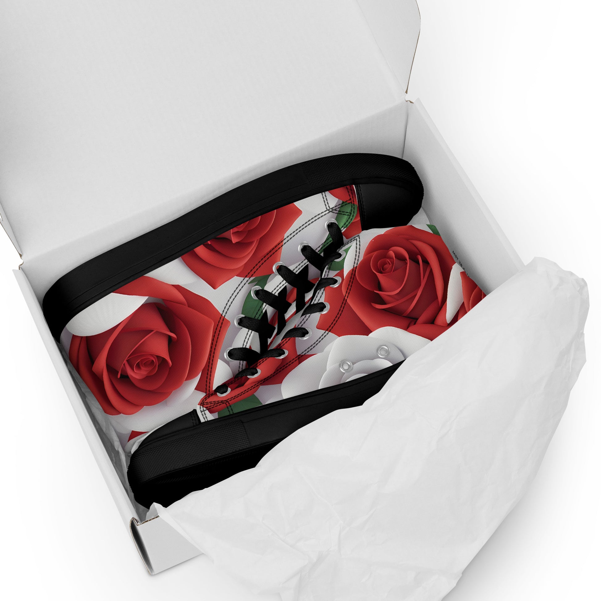 Shoes are what makes a look stand out—whether they match the outfit or not. The handmade Rose Print High Top Canvas Shoes have a retro feel to them, and can add the final touch to various clothing styles.