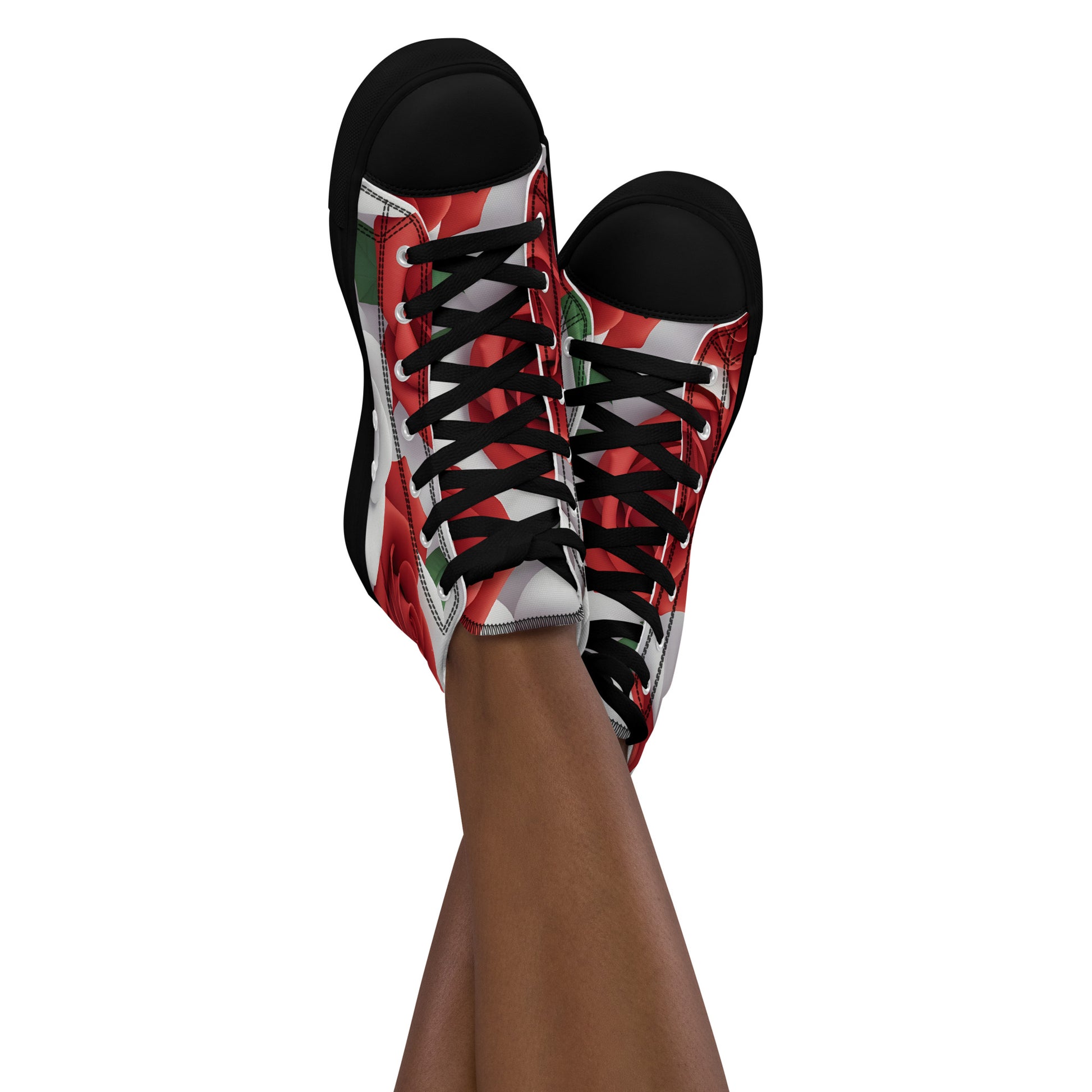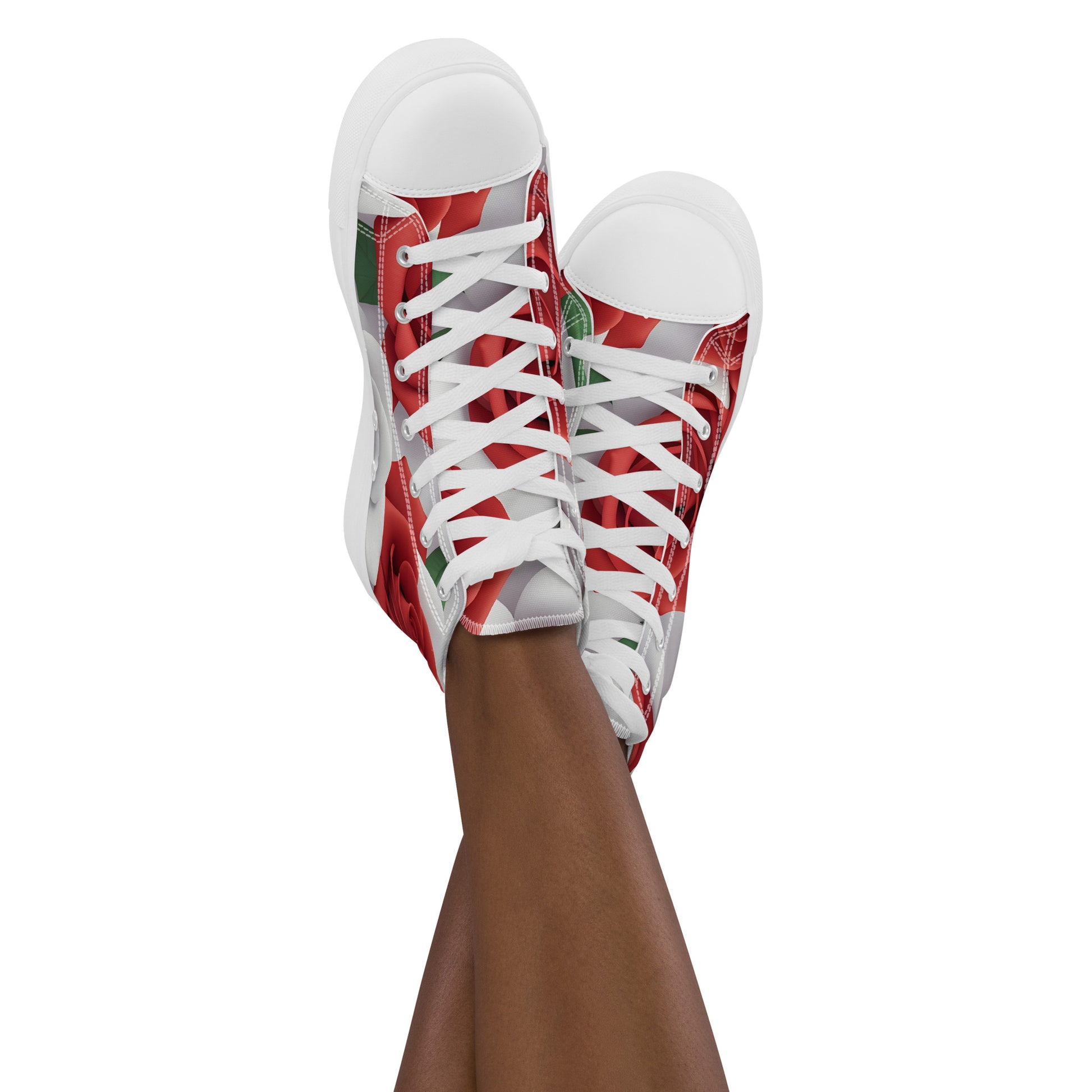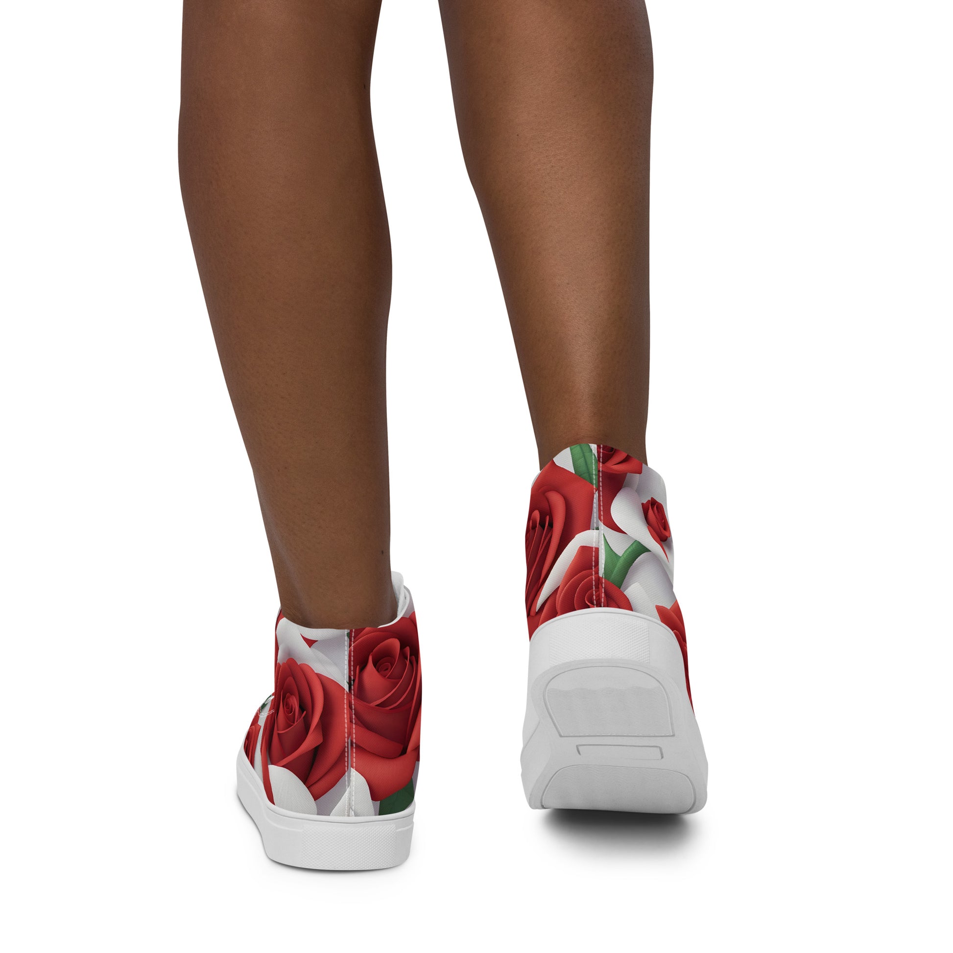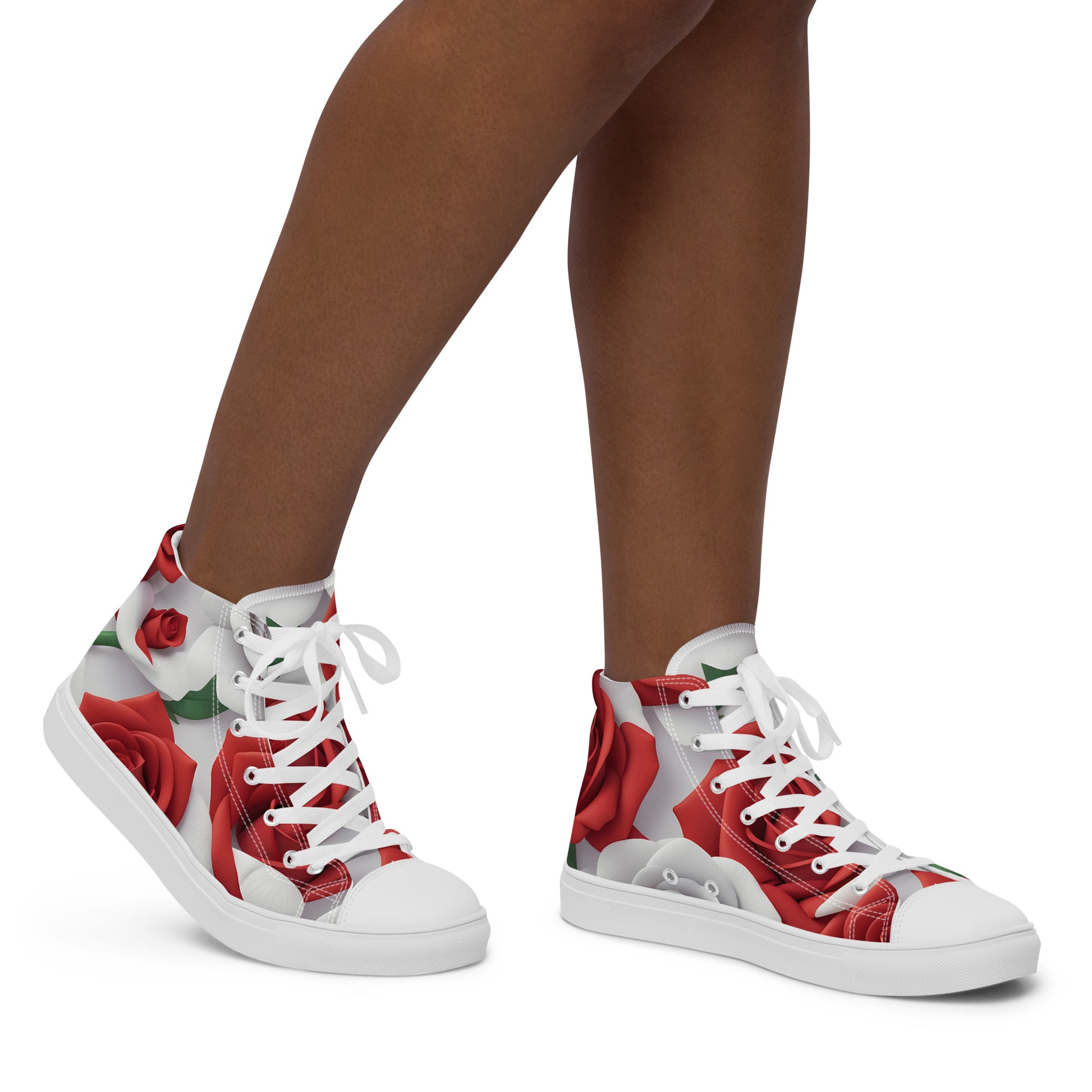 Shoes are what makes a look stand out—whether they match the outfit or not. The handmade Rose Print High Top Canvas Shoes have a retro feel to them, and can add the final touch to various clothing styles.