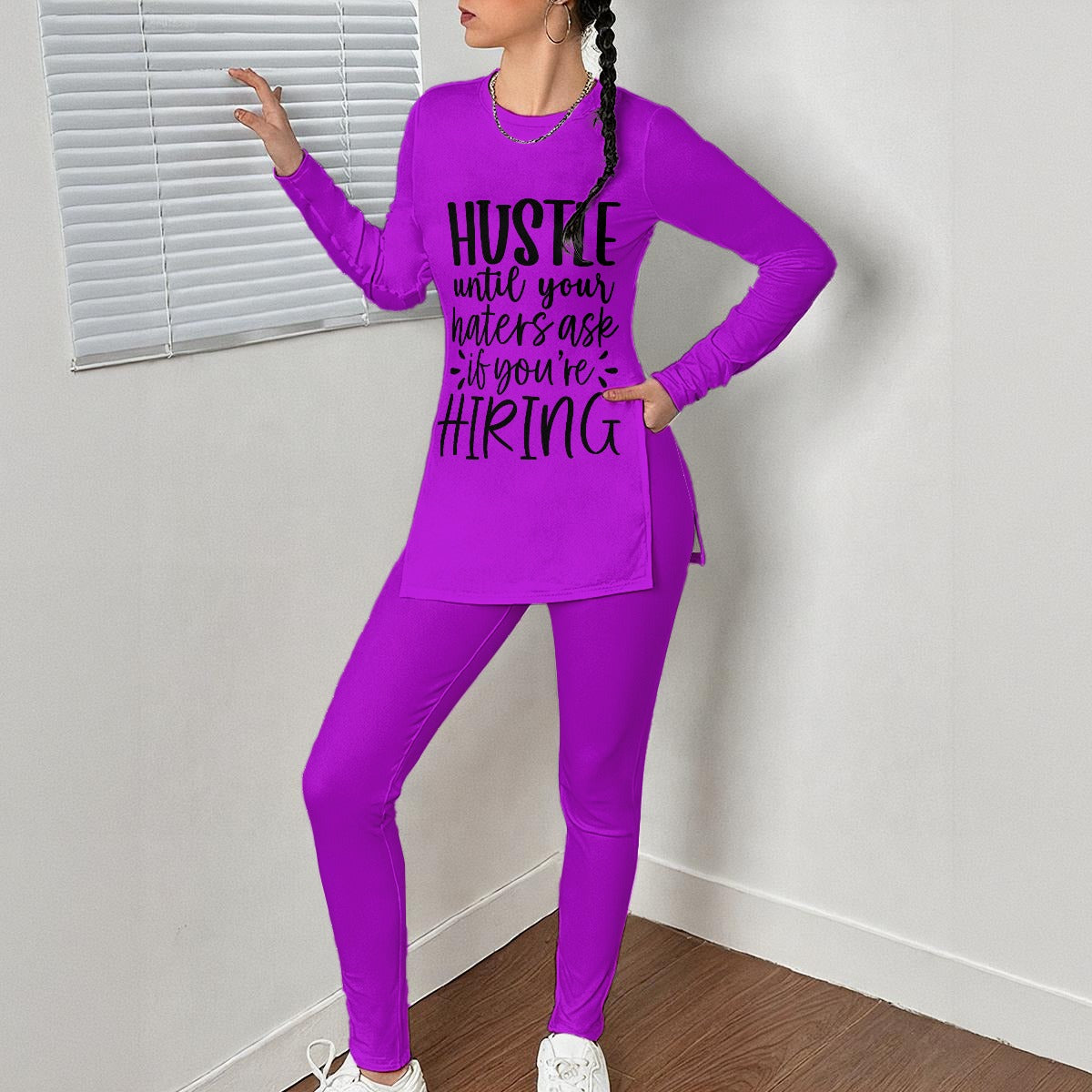 - Round-neck, long sleeves, oversize top with split design, and comfortable pants