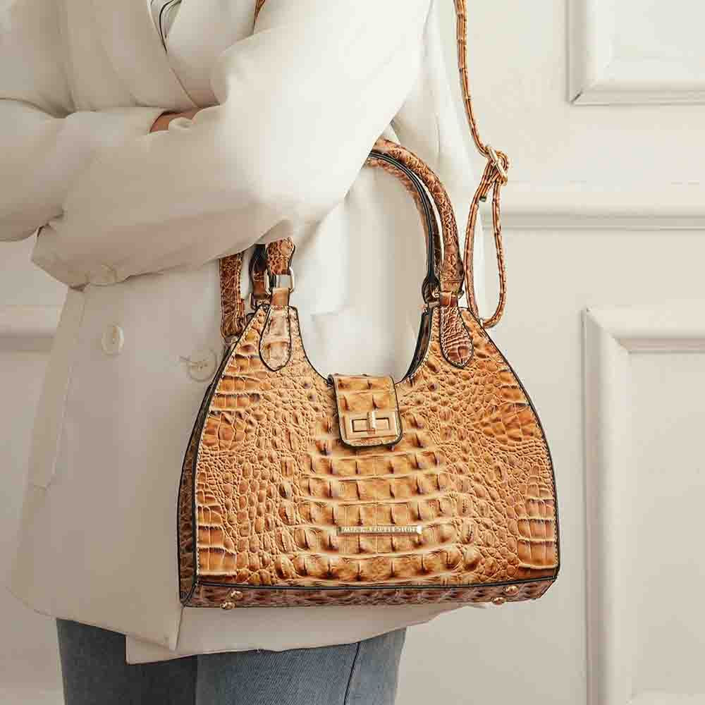 The Ava Tote Bag blends elegance with functionality, offering a sleek faux crocodile-embossed exterior and a secure turn-lock closure. Crafted from high-quality, cruelty-free materials, this bag is as durable as it is stylish. Its spacious interior with organized pockets keeps your essentials in place, while the back zippered pocket provides quick access to your smaller items. With a versatile, detachable strap, it easily transitions from a hand-held tote to a shoulder bag. Perfect for work, travel, or everyday use, the Ava Tote is your go-to statement piece for both style and practicality.