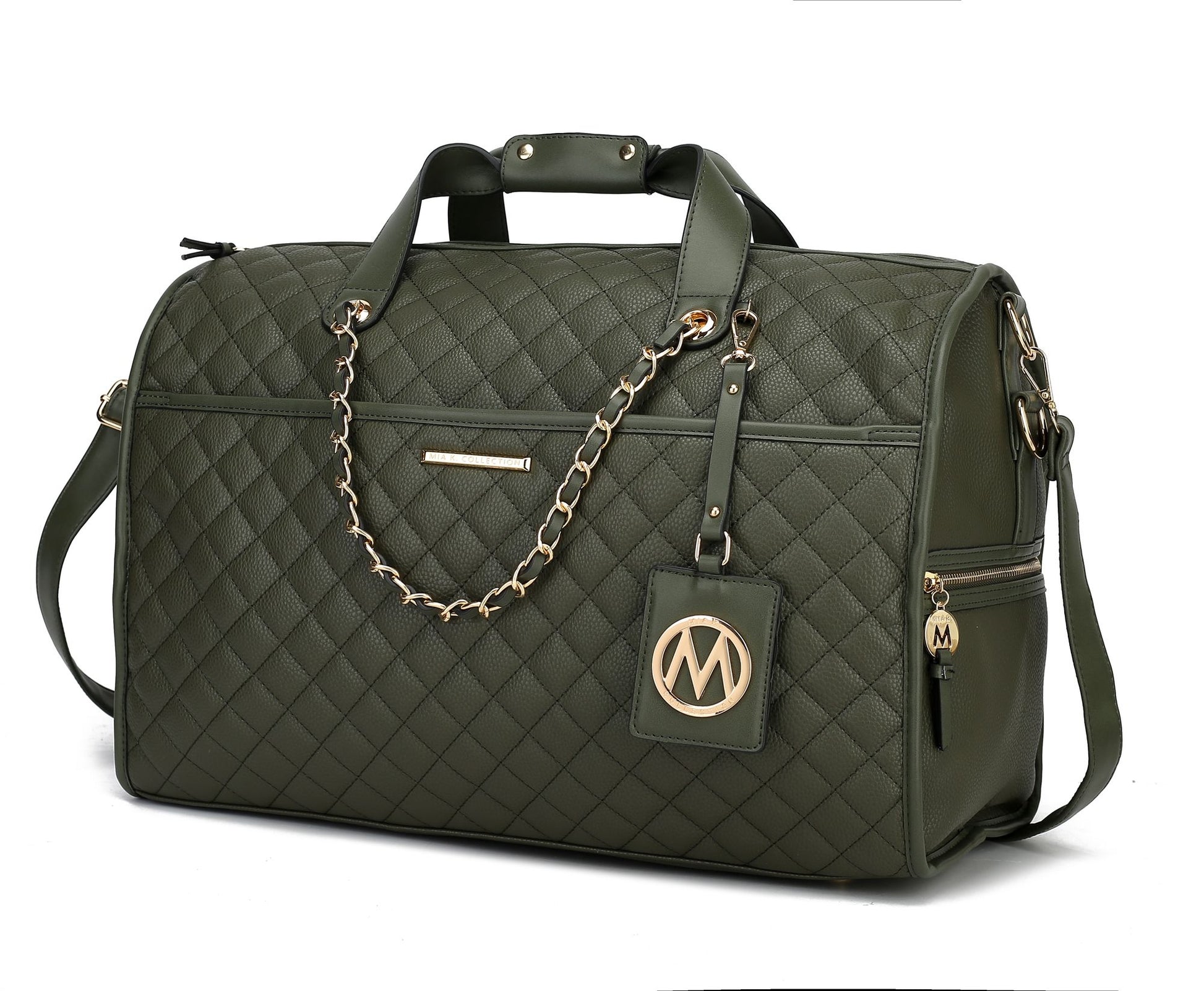- Feature: Stylish and versatile; the Lexie Duffle is your travel must-have; made for the modern woman. Crafted of high-quality pebbled vegan leather; the Lexie Duffle perfectly combines aesthetics with functionality. Elegantly built; with thoughtful compartments; zippered pockets; and a roomy interior; it can fit anything from an extra pair of clothes to in-flight essentials. The Lexie Duffle can also be your daily work bag or gym bag. Designed with luxurious gold-tone embellishment and a braided chain accent; the Lexie Duffle has two side zippered pockets for easy organization of all your travel necessities and a front pocket with a magnetic snap. In the back; it features a trolley sleeve and a zippered pocket. The Lexie Duffle has a structured silhouette with a flat base for stability with protective metal feet and a removable and adjustable shoulder strap; which makes it easy to carry. The Lexie Duffle has our signature Mia K Collection plate and a hangtag with our large emblem for decoration.